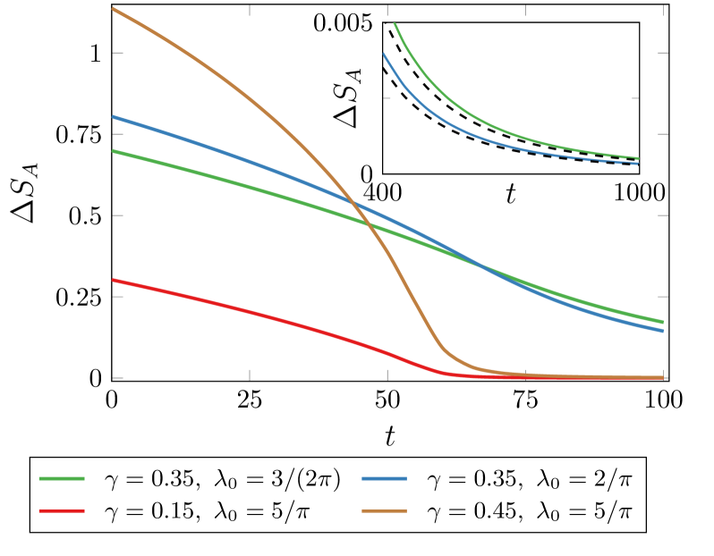 \[ \Delta S_A(t) = \tr[\rho_A(t)\log(\rho_A(t)) - \rho_A(t)\log(\rho_{A,Q}(t))]\] where symmetrized reduced density matrix \(\rho_{A,Q}(t) = \sum_q \Pi_q \rho_A(t) \Pi_q\), and \(\Pi_q\) is projector onto eigenspace of \(Q_A\) with eigenvalue \(q\).